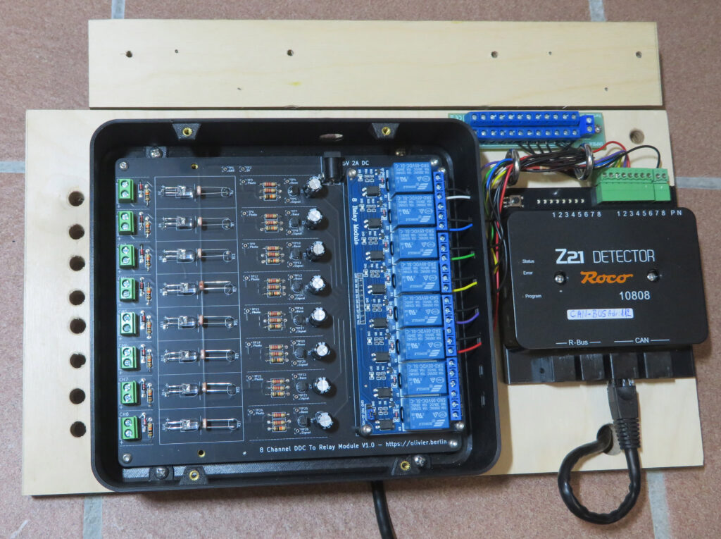 So musste ich nur diese Platine, welche über ein eigenes Netzteil gespeist wird, auf der einen Seite mit den sechs Boostern und auf der anderen Seite über einen Widerstand mit einem „Z21 Detector“ verbinden. Letzterer wird seinerseits von der Z21 gespeist.